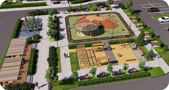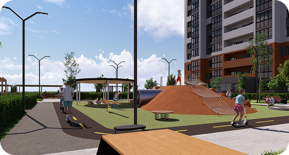 Игровые и спортивные площадки, зоны для работы на свежем воздухе и дружелюбного соседского времяпрепровождения.